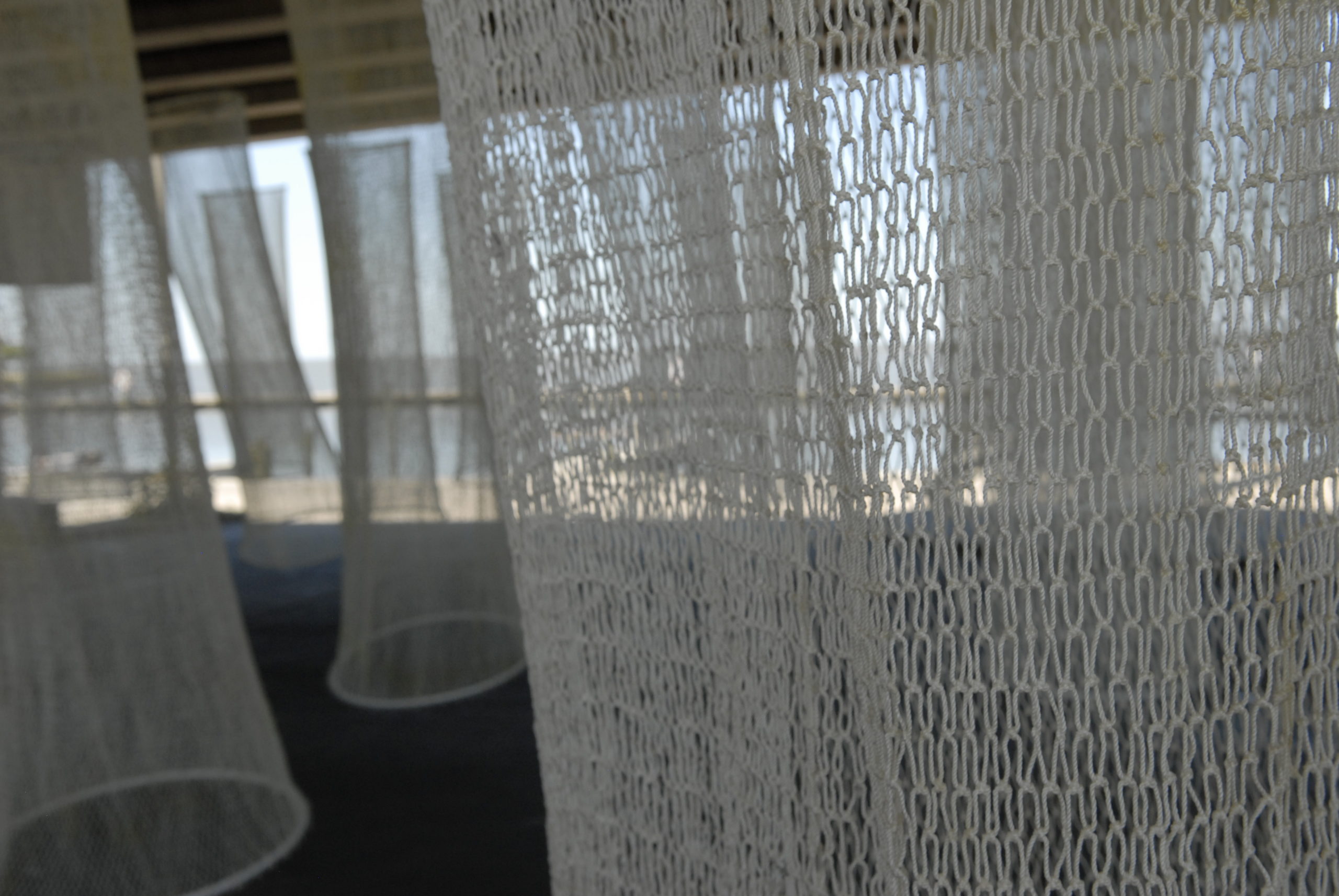 A grid of sixty-six “ghost columns” made of fishing net were suspended under the Industrial Canal bridge, recasting familiar elements of muscular infrastructure as ephemeral and fragile as the diminishing coastline of Louisiana. The installation served as a meeting place for organizations dedicated to coastal issues.