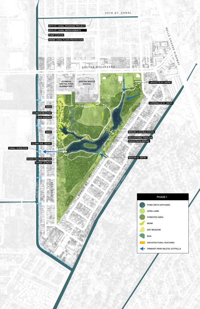 The landscape design approach starts with stormwater and layers on improvements to access, passive recreational opportunities, and habitat and water quality. Space is created in the Park for stormwater storage now, with capacity that serves as an enabling project for future flood mitigation. Gretna City Park is the first of six pilot projects to break ground for the LA SAFE Program, funded through the National Disaster Resilience Competition.