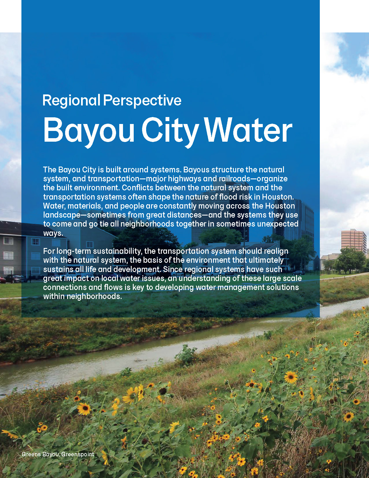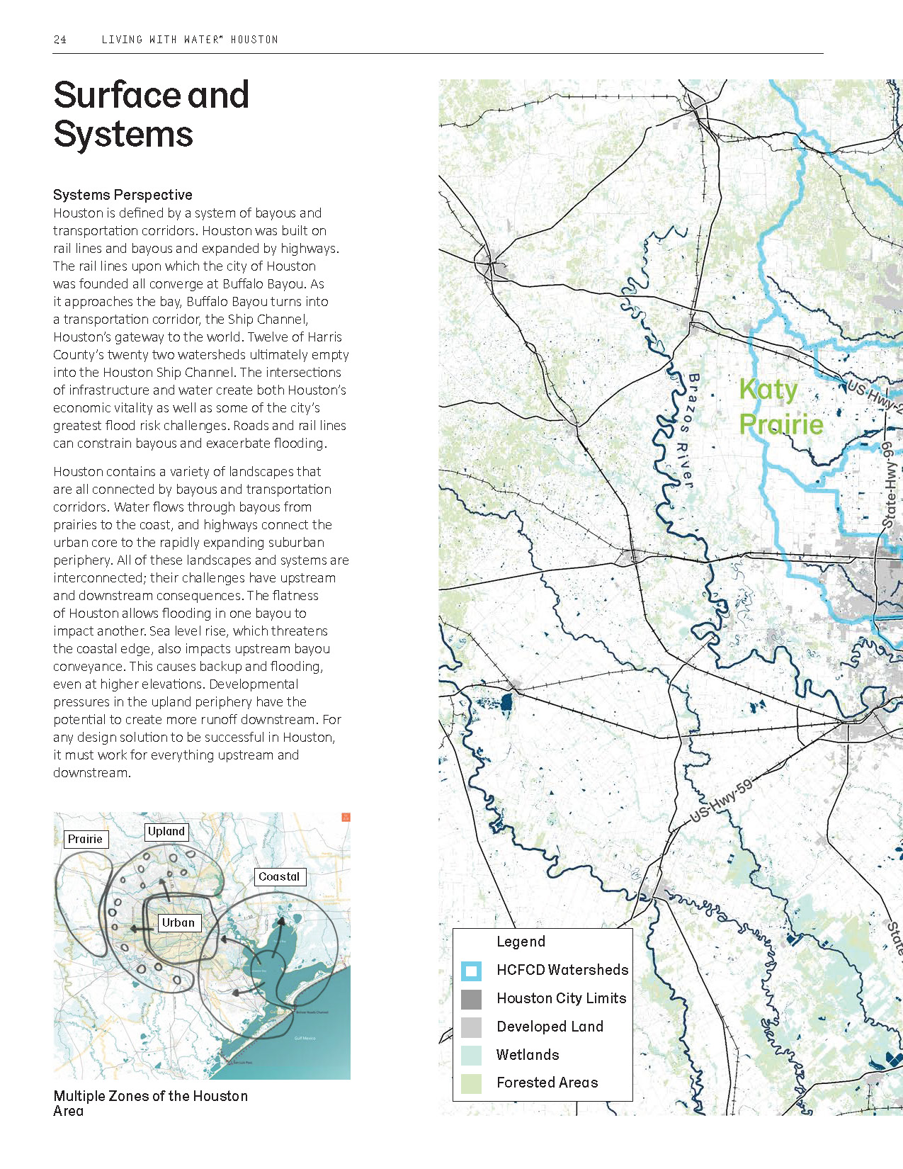 Living With Water® Houston builds on the many local efforts underway to reduce flood risk and provides a framework and illustrative vision for aligning future actions. The strategies presented in this document should be embraced, localized, developed, and deployed to address the increasing riverine/bayou, urban drainage, and storm surge flooding that threatens Houston.