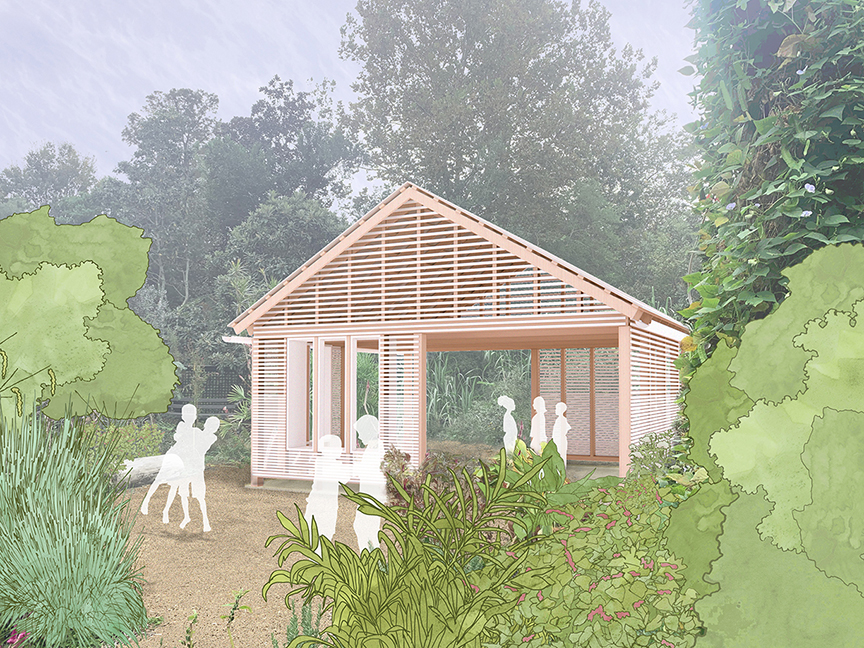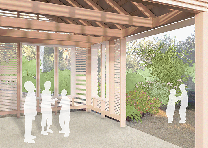Set within the Discovery Garden, the new pavilion will match the volume and footprint of the two-classroom Rosenwald School’s “industrial room”, featuring a gabled roof and tall windows to echo the school’s iconic profile. This room, known also as the “community room” or “lab space”, was a space for students and adults to learn hands-on skills for use outside of the classroom.