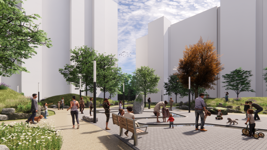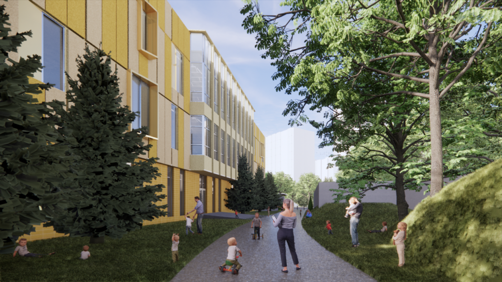 Working together over two years, Waggonner & Ball studied multiple site locations with different conditions, as well as alterations to the program, in close collaboration with the Owner. The academic buildings include an early childhood center, elementary school, middle and high school, and a large athletics facility. Landscape design by Waggonner & Ball harmonized the buildings with their landscape and connects to apartments on an adjacent block.