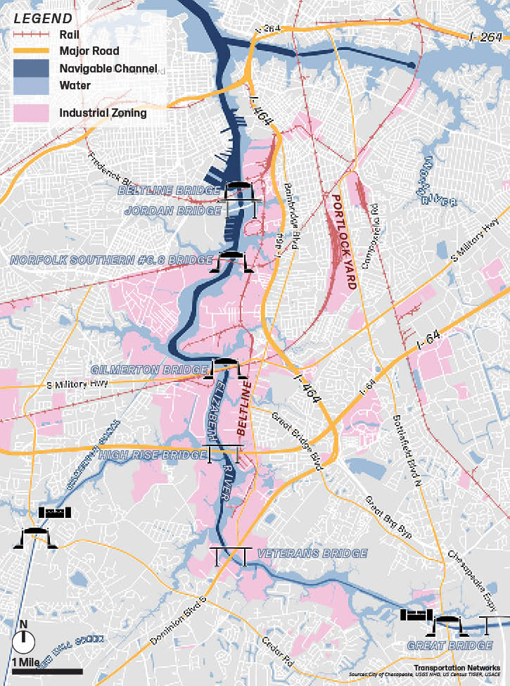 The Chesapeake Industrial Waterfront Study is a planning effort led by Waggonner & Ball and Moffatt & Nichol focusing on a 10-mile long stretch of the Elizabeth River in Chesapeake, VA. Significant waterfront industrial activity occurs along this river, particularly towards the northern city boundary where the channel is regularly federally maintained and there are fewer height constraints like bridges. However, the waterfront is also a prime location for all types of real estate including residential and commercial, and these uses often compete for space. Complicating things further, Chesapeake is experiencing increased coastal hazards including heavy rain events, recurrent flooding, and sea level rise. As such, two goals of the study were to understand the current condition of the industrial waterfront and to determine preferred uses based on current and future conditions relative to coastal hazards.
