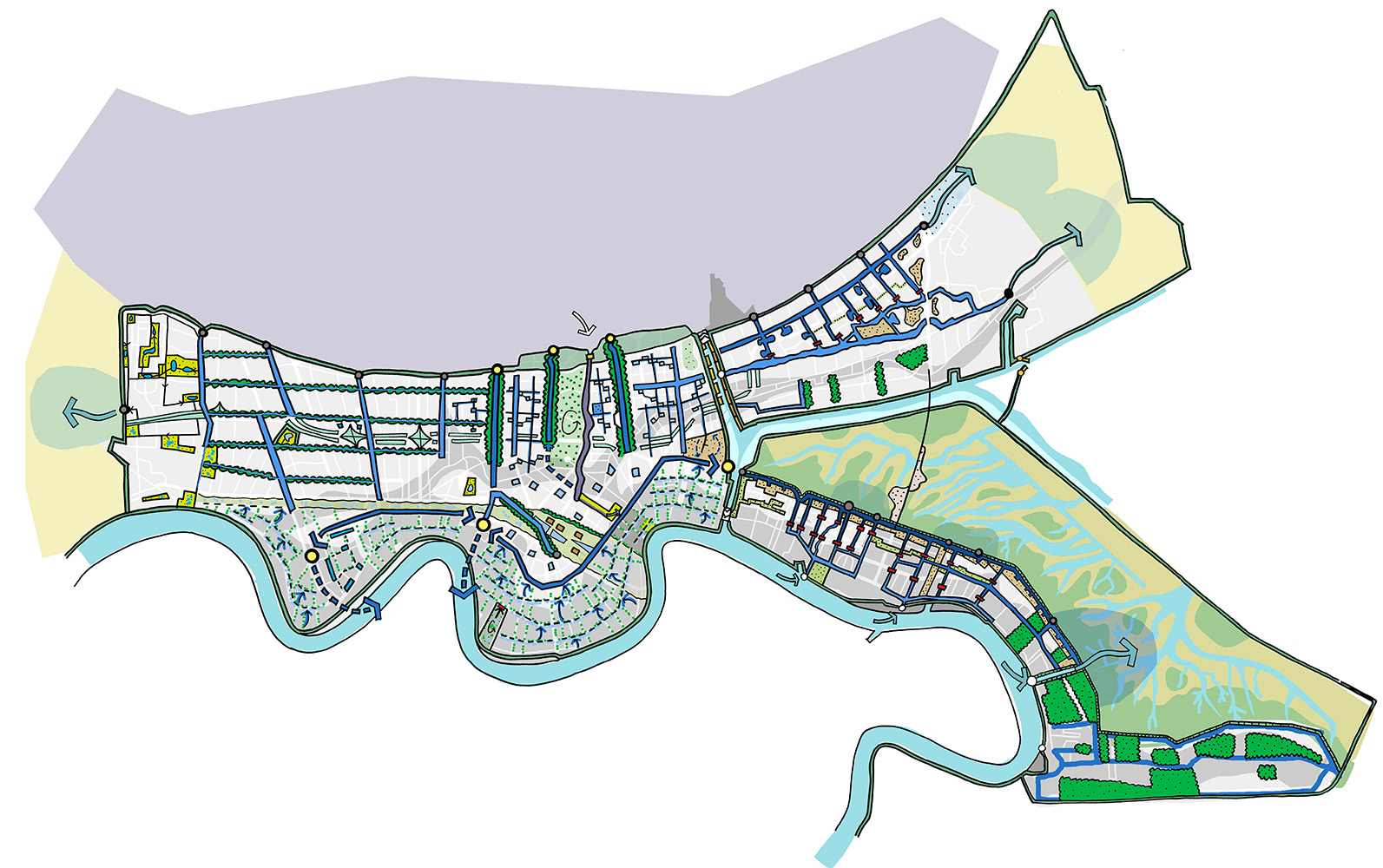 Building on existing infrastructure one step at a time, the long-term vision of the Urban Water Plan is to increase water storage capacity by layering a system of waterways on street grids that supplements the current drainage system.
