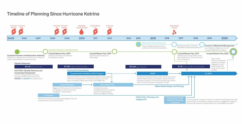In a region with a thriving coastal economy and a rich culture endangered by flood risk, the LA SAFE adaptation strategy outlines measures to enhance community resilience, economic prosperity, and quality of life for everyone in the region. It aims to address the myriad human, economic, and environmental impacts of past and future floods, through transformative regional thinking across six parishes and more than five million acres of land and water.