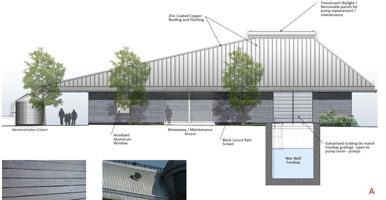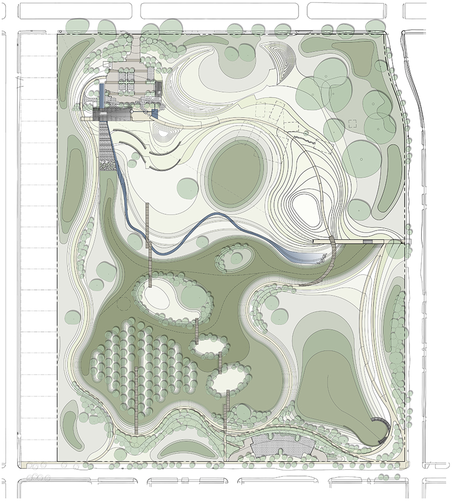 As a demonstration project, Mirabeau Water Garden will be a model for other open spaces and institutional sites throughout the city and region. As a living laboratory, the site will act as a recreational amenity, educational outpost and test bed for water best practices. As a building, it’s all about the roof: an oversized, wide-brim hat that emphasizes how water moves from sky to gutter to ground (or cistern) and provides just the right volume for pump equipment clearances inside.