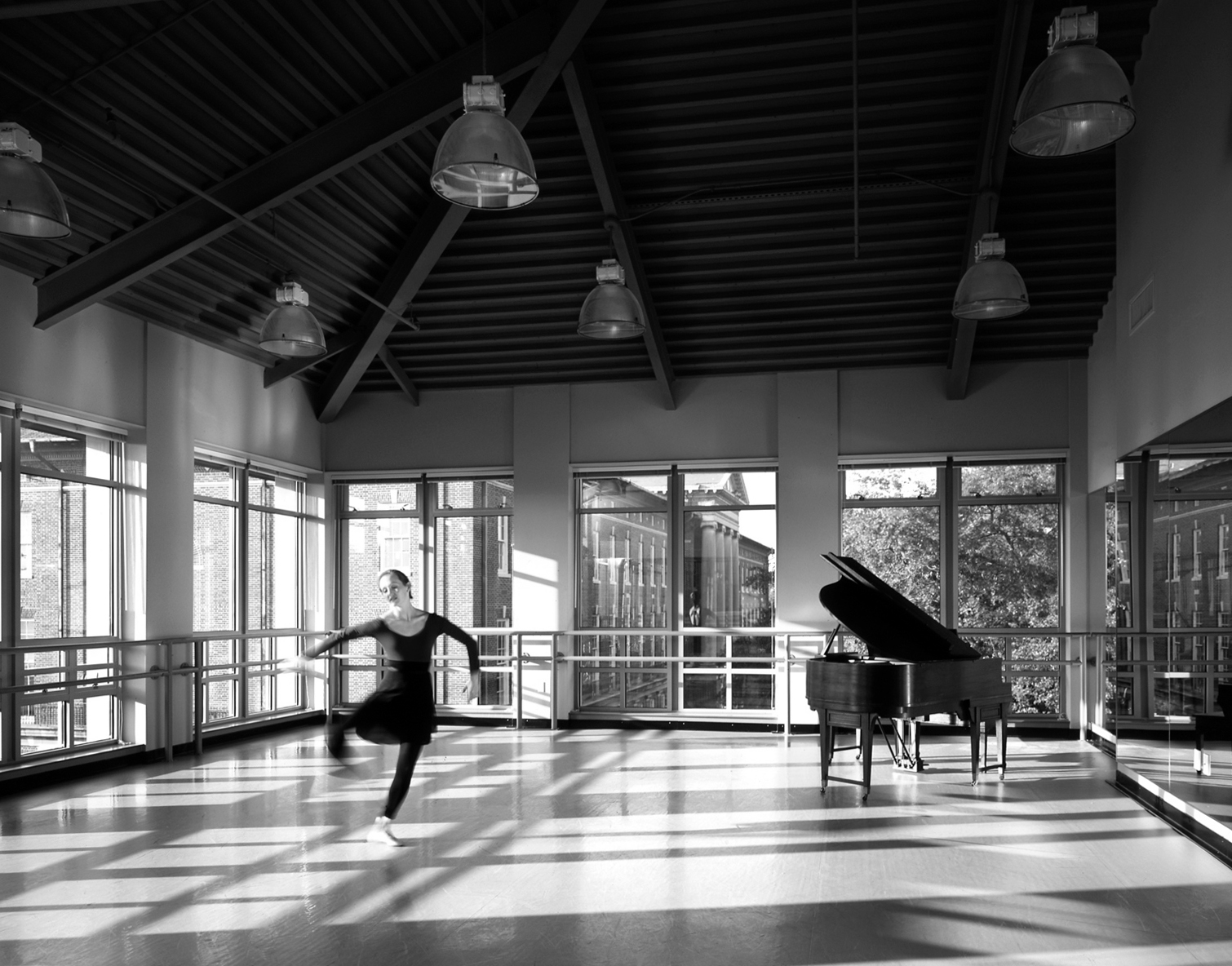 Three large dance studios comprise the third story. Here a change in expression to an aluminum and glass façade beneath projected eaves diminishes the apparent height of the building while providing the studios with unobstructed views of the mature oak treetops, adjacent buildings, and the horizon. Variations in plan from floor to floor are achieved by moving the corridor from west to east, from bottom to top, as section height and fenestrations modulate. An enclosure that at first appears uniform and regular accommodates a program of diverse, specific spaces. This university building thus mediates between outside and inside, past and present.